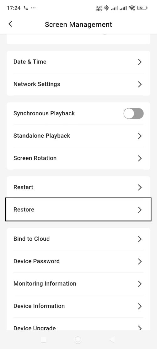 Перейдя в раздел "Screen Managment" пользователь должен найти строку "Restore" и перейти в нему с помощью нажатия на строку.