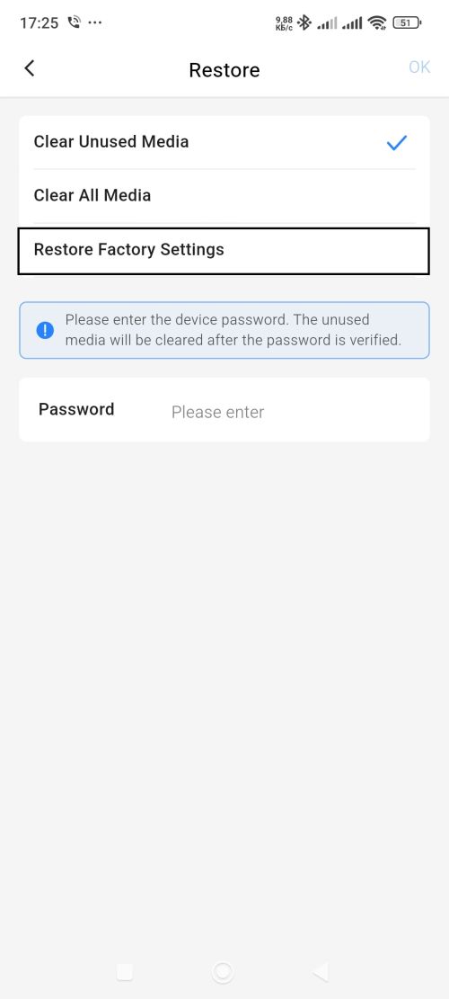 Пользователь имеет возможность, в случае неправильной настройки устройства сделать его сброс до заводских настроек. Удобнее всего это сделать через мобильное приложение Viplex Handy: