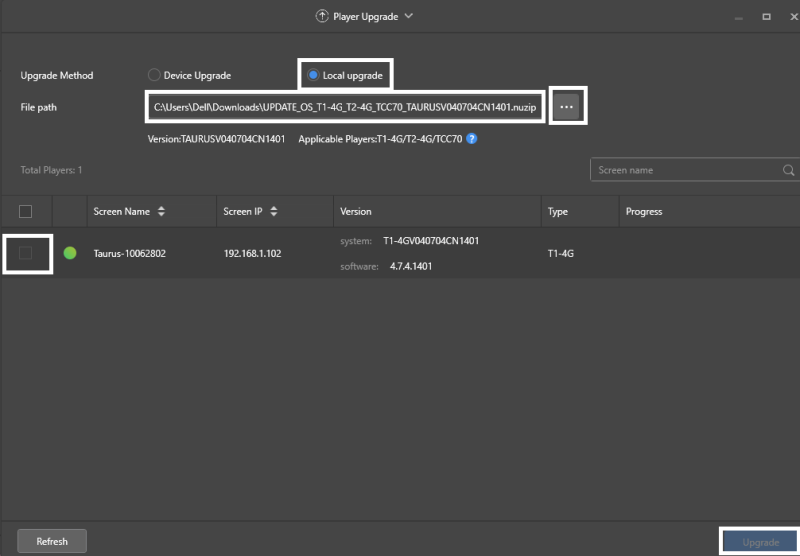 Далее пользователю должен слева внизу приложения выбрать нужное устройство с помощью чекбокса/галочки и нажать на кнопку "Upgrade", чтобы началось обновление прошивки на необходимом устройстве.