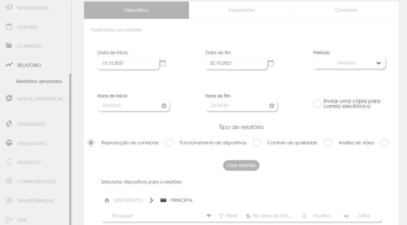 Visualização de relatórios de prova de reprodução por vários parâmetros, estatísticas sobre a operação do dispositivo