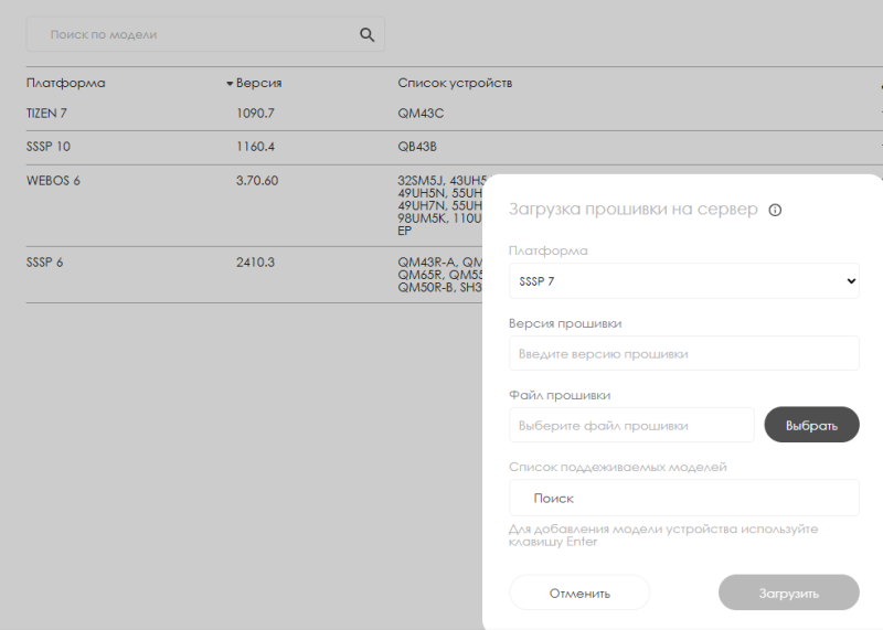 - Добавлена возможность загрузки дистрибутива Tizen OS/ WebOS в личный кабинет