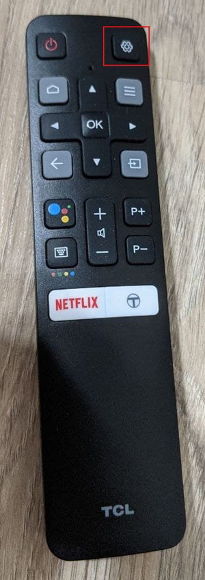 1. Pegue o controle remoto do dispositivo e pressione a engrenagem nele (destacado em um quadrado vermelho na imagem)