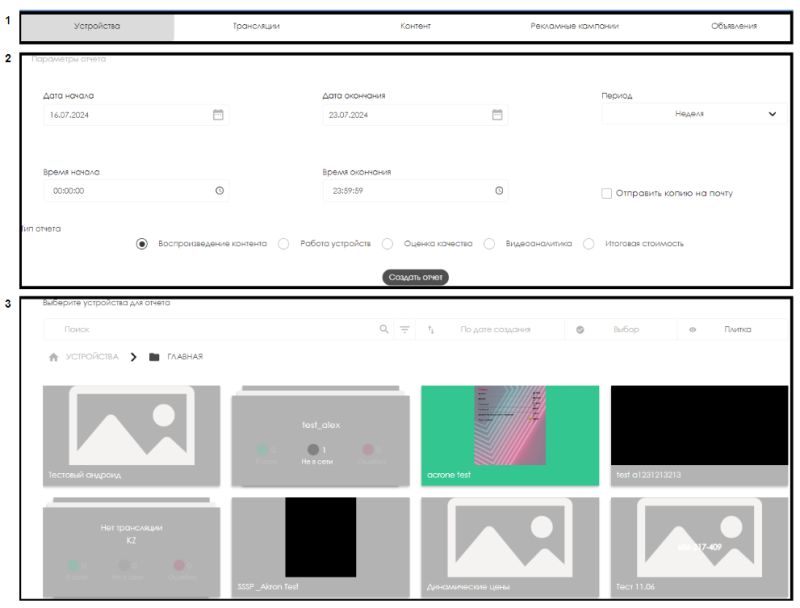 Весь раздел поделён на несколько рабочих зон, позволяющих выбрать какой формат отчета необходим и от какого устройства должен поступить отчет.