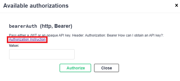 Clicking the "Authorize" button opens a modal window where the user must enter a bearer token. Instructions for obtaining the token are provided via a link in the window.