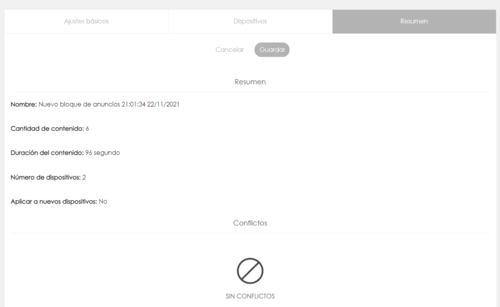 Luego pasamos a la página de resumen. Se muestra información sobre el bloque de anuncios, la duración del relleno y los conflictos que pueden estar presentes. Por ejemplo, el conflicto es que anteriormente no había ningún bloque de anuncios en el dispositivo.